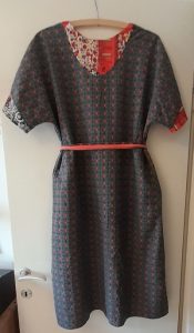 האמת הבד היה די יקר, לכן קניתי מספיק בד לשמלה עם שרוולים קצרים שאותם חתכתי ישר יחד עם גוף השמלה כדרכי אז , יצרתי פתח צוואר שהינו זהה משני הצדדים , מה שאיפשר ללבוש את השמלה כמותשהי בלי לחשוב היכן החלק הקדמי. ולדעתי גם הפחית את הבלאי של השמלה.[מה לעשות ו'איזור הישיבה' סובל מבלאי מוגדל], אז אם אין לשמלה גב קבוע , הבלאי פחות.
