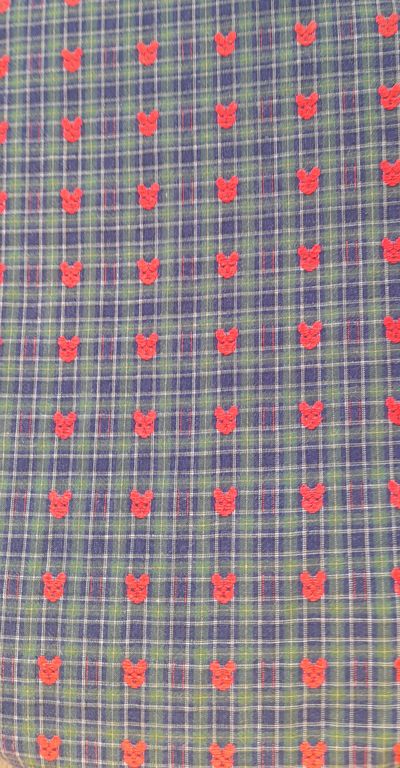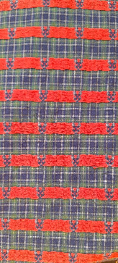 את שמלת המקור תפרתי מבד מסורתי פלמי , שקניתי באחד מביקוריי בברוסל אצל אבי. האמת שהבד שלה טיפה 'כבד' או 'צפוף אריגה מדי לשמלת קיץ. בד המשבצות הקטנותבירוקים ומעט שחור,מקושט באריגת ריקמה של מעין פני חיה, מחוט אדום כשבין 'פנים' ל'פנים' מונחים שפע חוטים לאורך 2.5 ס"מ עם אחיזות שתי ספורות ולגובה של 1.5ס"מ. החוטים הללו יוצרים פסים של כיסי אוויר שמחממים את פנים השמלה.